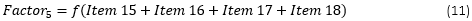 0.49, 0.20, 0.64, 0.74, 0.86 son las cargas resultantes del análisis de factores para las variables respectivas. 5 es el número de dimensiones consideradas en el instrumento.