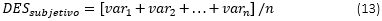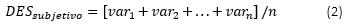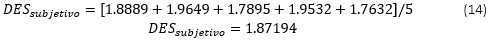 Del cálculo anterior se obtienen los promedios de las dimensiones en una matriz de n filas (número de sujetos encuestados) y 6 columnas (promedios de las dimensiones). En cuanto al aspecto subjetivo deberá sumarse cada variable promediada y dividir entre el número de dimensiones, ver (2).