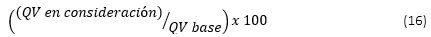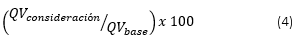 Hasta aquí (2) y (3) se han obtenido los coeficientes que son la base del índice (QV base), los autores sugieren expresar años de comparación (QV en consideración) anteriores o posteriores al año base, en términos porcentuales, para la comodidad en la percepción de la variación en el índice a través del tiempo, utilizando (4).