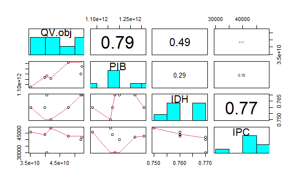 La Figura 1 describe la interacción del aspecto objetivo del índice QV con respecto al PIB, al IDH y al IPC. Por debajo de la diagonal se muestran las gráficas de dispersión de cada una de las interacciones entre indicadores. En la parte superior se muestran las correlaciones entre variables.