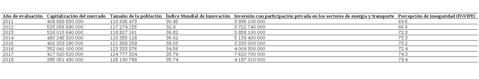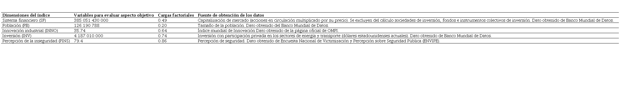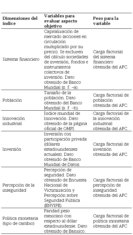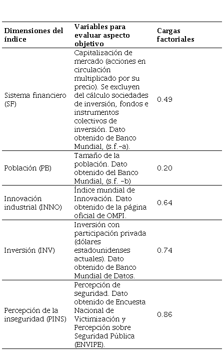 Se consideraron cinco factores que se supone son explicados por las variables: Sistema financiero, Población, Innovación industrial, Inversión y Percepción de inseguridad.