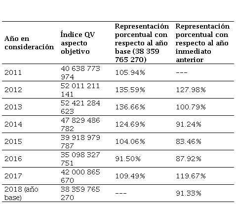En la Tabla 11 columna 3 se observa el índice QV objetivo de 2018 (año base), el cual funge de comparación con respecto al periodo de 2011 a 2017. Se destaca que para los años 2011 a 2015 y en 2017, el índice QV fue mayor que para el año base.