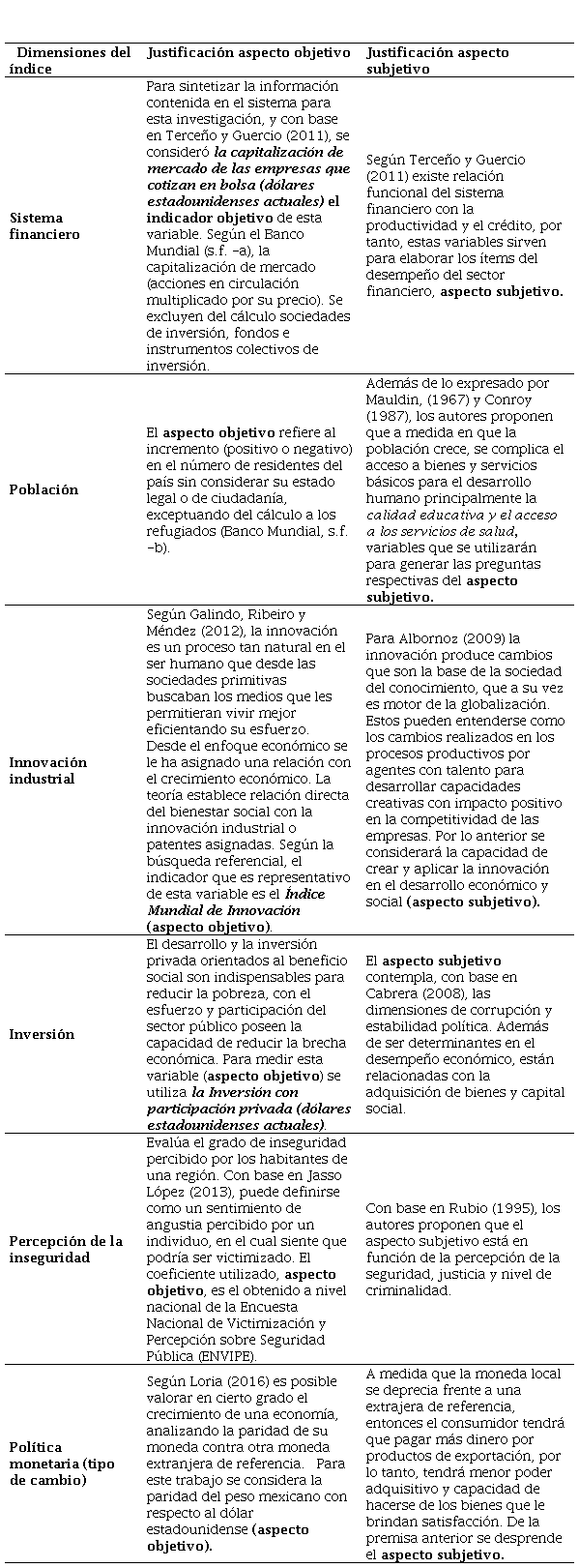 A partir del AF, las dimensiones del índice se redujeron de seis dimensiones y veinte preguntas a solo cinco dimensiones y dieciocho preguntas (Tabla 9). Se construyó un indicador que contempla la evaluación del crecimiento económico a partir de dos enfoques: enfoque subjetivo, a partir del instrumento validado estadísticamente; y enfoque objetivo, a partir de la evaluación de cinco dimensiones ponderadas a partir de cargas factoriales (Tabla 8).
