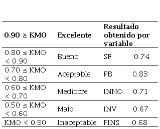 El resultado de la prueba de adecuación KMO para el modelo, mostró los niveles de adecuación descritos en la columna 3 para la adecuación individual; dos variables se encuentran en nivel aceptable, SF y PB, dos variables se encuentran en la franja de decisión, INV y PINS, y una se encuentra en bueno. Se observó un coeficiente global de adecuación de (0.71).