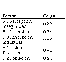 Las cargas factoriales mostraron que el factor 5, asociado con percepción de la inseguridad, tiene la carga mayor, 0.86; en segundo lugar, se encuentra el factor 4, de inversión, con un coeficiente de 0.74; en el orden descendente le sigue la carga de innovación industrial, con 0.64; la carga del factor 1, de sistema financiero, muestra carga de 0.49; y finalmente la carga menor corresponde a población, con 0.20.