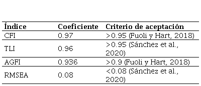 Los índices globales RMSEA (Root Mean Square Error of Approximation) AGFI (Adjusted Goodness of Fit Index), CFI (Comparative Fit Index) y TLI (Tucker-Lewis Index) permitieron apreciar el ajuste del modelo. En general valoran globalmente las diferencias entre las matrices de varianzas y covarianzas observadas versus las calculadas. Sería deseable que las diferencias fueran mínimas (Fuoli y Hart, 2018). En la Tabla 5 se muestran los resultados de estos índices de ajuste.
