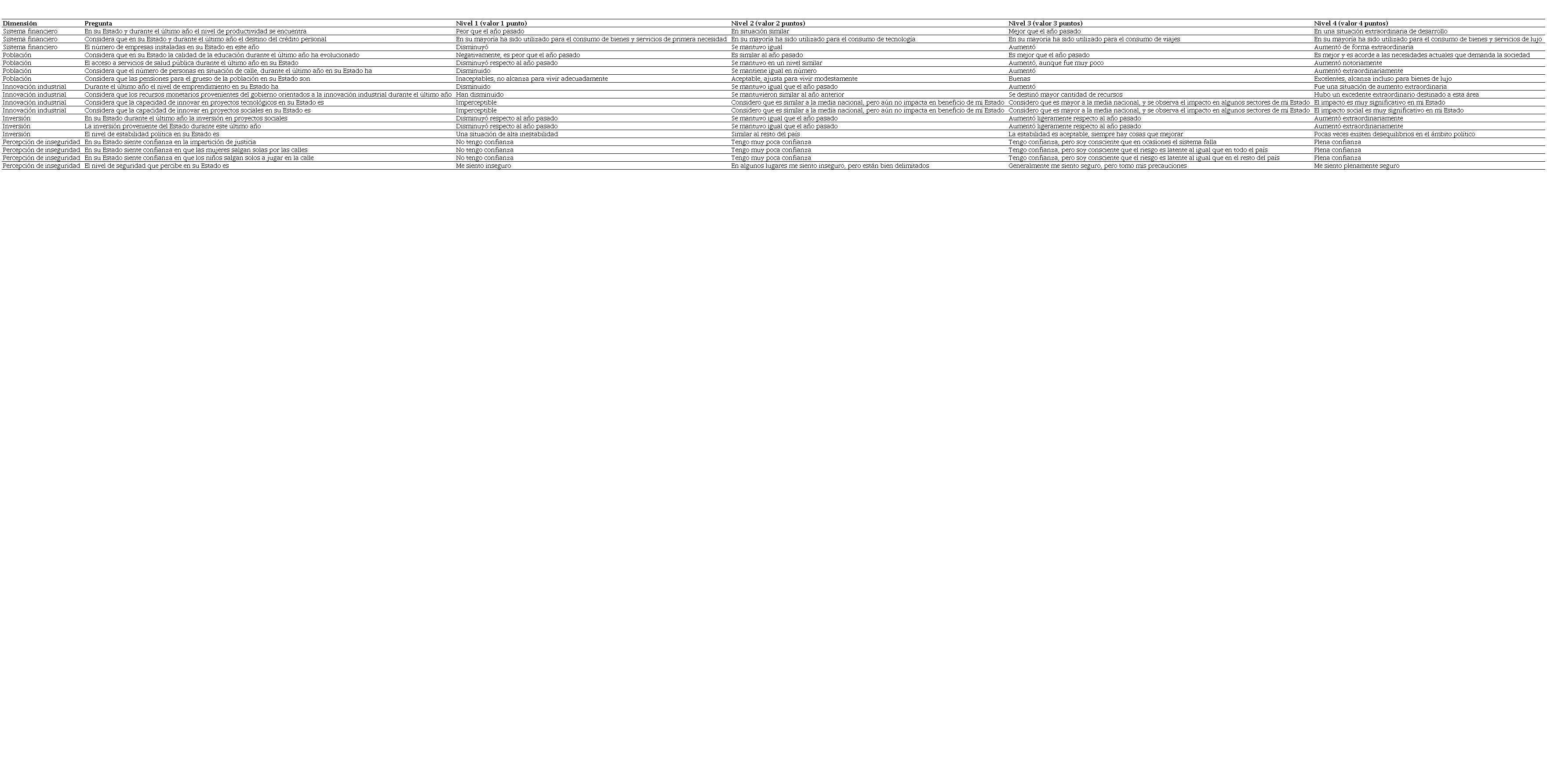 Posterior a la identificación de las seis dimensiones (y con base en ellas) se elaboró un instrumento con 20 ítems (ver Tabla 6) representativos y una escala ordinal tipo Likert que va del número 1 al número 4 en donde el orden ascendente refiere al grado en que se posee alguna característica de interés, es decir el número 1 posee en menor grado alguna característica de interés con respecto al número 2, esta característica se generaliza para el resto de la escala. Es importante comentar que los ítems considerados provienen de una amplia reflexión derivada de un análisis bibliométrico en Scopus, de cómo es el entorno económico actual y cuáles son las condiciones sociales que más preocupan a las personas. Este ejercicio de análisis permite que el índice tenga un mayor sentido de pertinencia con respecto a otros indicadores que han permanecido vigentes sin cambios en su metodología para valorar la dinámica social del país.