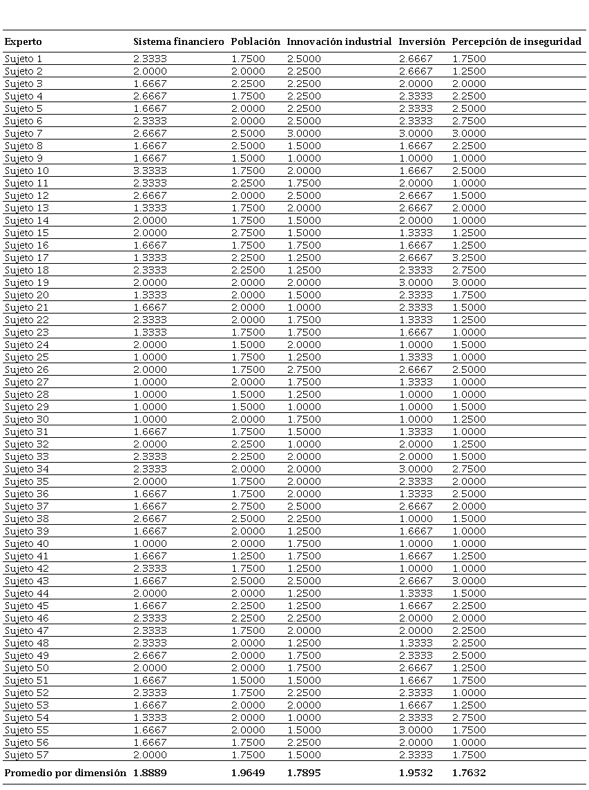 De las veinte columnas (preguntas), tres corresponden a la dimensión de sistema financiero (SF); cuatro a población (PB); cuatro a innovación (INNO); tres a inversión (INV); cuatro a percepción de inseguridad (PIN) y dos a tipo de cambio (TC). Consecuentemente se calculó un promedio aritmético por dimensión de los valores obtenidos de las respuestas de los expertos, es decir se calculó el promedio de las primeras tres preguntas el cual es un coeficiente numérico de la dimensión SF. Esta mecánica se generalizó para el resto de las dimensiones.