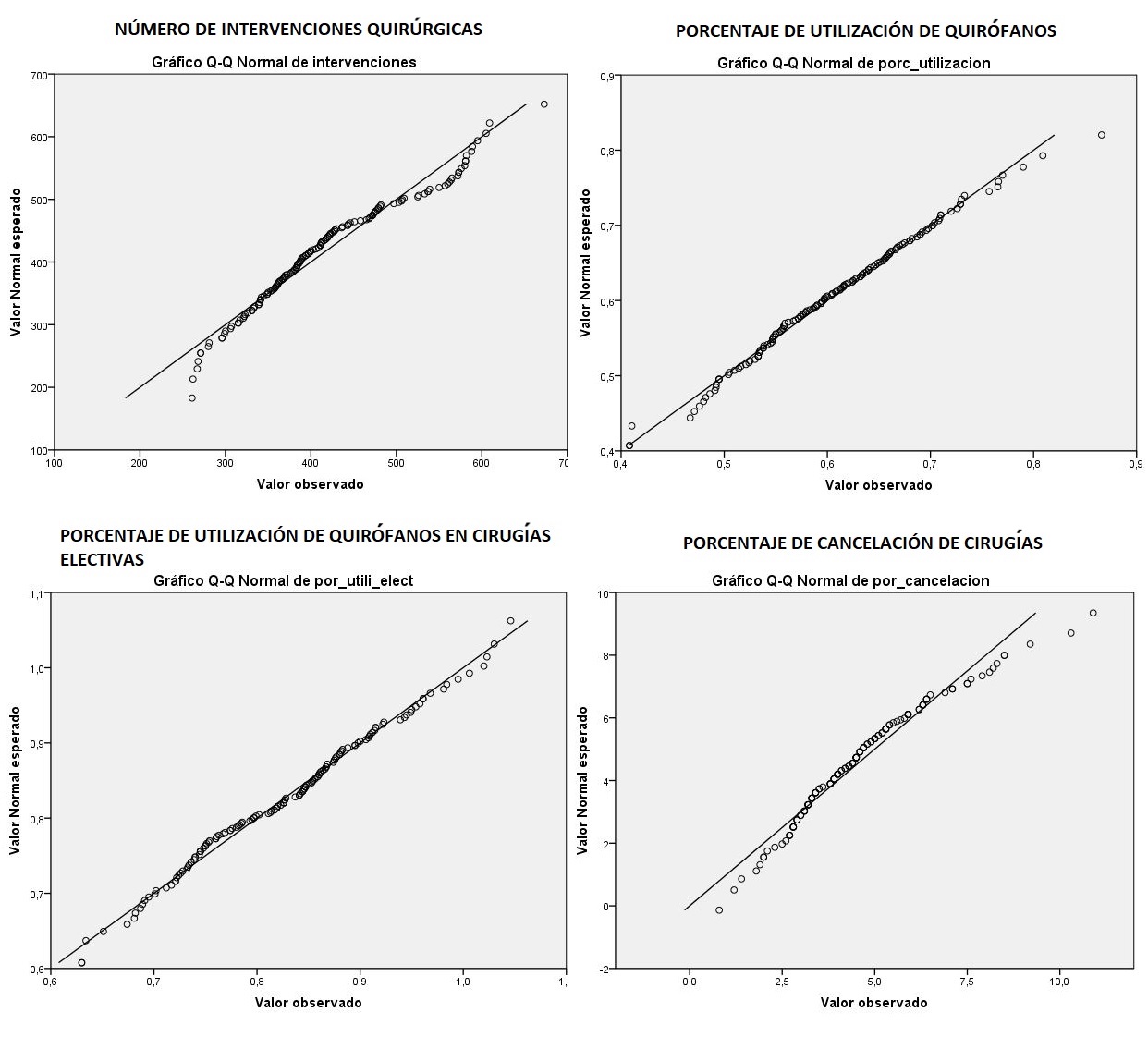 La Figura 4 presenta los gráficos Q-Q para los cuatro indicadores analizados. Esta gráfica presenta dos indicadores: porcentaje de utilización de quirófanos y utilización en cirugías electivas, los cuales sus errores siguen una distribución normal, los puntos se distribuyen sobre la recta de 45 grados indicando que los valores se encuentran ajustados a la distribución normal, esto garantiza que la información proviene de datos aleatorios distribuidos normalmente.
