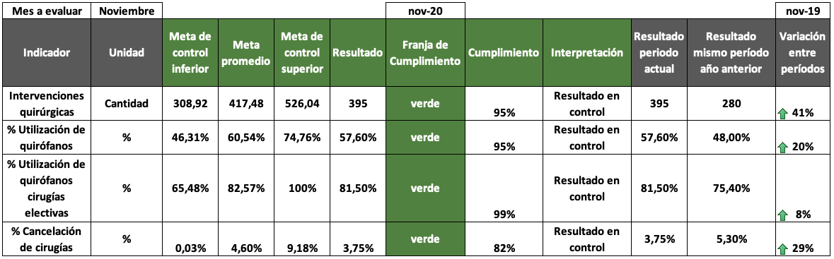 La Figura 6 presenta una propuesta de control para el área de cirugía general utilizando la información obtenida para cada indicador, luego de hacer el análisis estadístico pertinente y con base en el recálculo de los límites de control de cada uno de los indicadores, que se realizó partiendo de la omisión de los puntos en cada uno de los gráficos, que generan que los indicadores estén por fuera del control estadístico. En esta propuesta se puede observar que cada indicador posee una unidad de medida y tres límites de control o metas recalculadas. Para el periodo de estudio de ejemplo, se obtuvo su resultado y aplicando funciones de alcance de metas se calcula su cumplimiento, el cual se marca con la clasificación: verde, amarillo y rojo. Esta indicación permite analizar hasta qué punto se ha cumplido la meta. Por otro lado, se incluye una interpretación que busca alertar cuando el resultado está en control o fuera de control con base en los límites establecidos. Finalmente, el cuadro de mando compara la variación entre periodos para indicar si este incremento ha sido positivo o negativo, comparando así dos periodos de los años 2019 y 2020.