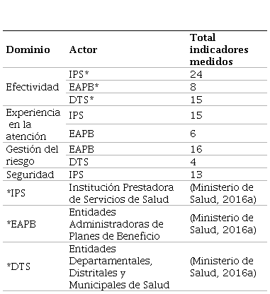 En el ámbito nacional, el Ministerio de Salud (2016b), a través del Observatorio Nacional de Calidad en Salud, monitorea los indicadores de los servicios de salud departamentales y municipales de los diferentes centros e instituciones de salud. En la Tabla 1 se observan 101 indicadores medidos, de los cuales el 51.4 % corresponden para las IPS. Estos indicadores están clasificados por cada actor del sistema de salud y por cada una de las cuatro categorías implementadas por el ministerio.