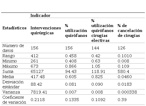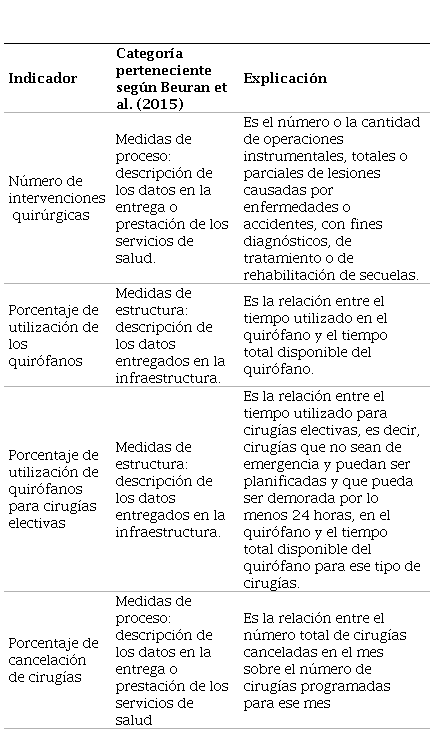 En este caso específico, la institución de salud objeto del análisis considera dentro del servicio de cirugía general los siguientes indicadores: número de intervenciones quirúrgicas, porcentaje de utilización de los quirófanos, porcentaje de utilización de quirófanos para cirugías electivas y porcentaje de cancelación de cirugías.