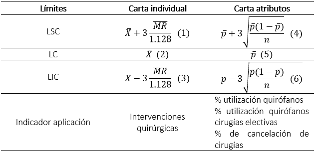 Escalante (2005) y Gutiérrez Pulido y de la Vara Salazar (2005) presentan la metodología teórica para proponer un control del proceso de cirugía para muestras individuales; asimismo, se utiliza la carta para atributos. Esta metodología consiste en encontrar tres límites principales, tal y como se presentó con anterioridad: límite superior de control (LSC), límite central (LC) y límite inferior de control (LIC) sobre el conjunto de datos. Estos límites establecen las bases sobre las cuales las muestras que se tomen deben adecuarse a estas franjas fijadas por los límites creados, para entrar en dos posibles categorías: procesos fuera de control estadístico o procesos en control estadístico. Este método de control es útil para investigar y establecer las causas que originan la variabilidad de los procesos productivos o en servicios. Por otro lado, los indicadores asistenciales deben tener métricas y límites claros, que indiquen el correcto desempeño de los datos para medir objetivos e iniciativas estratégicas (de la Garza García et al., 2013).