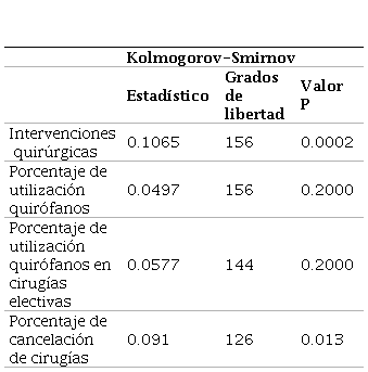 De acuerdo con la Tabla 6, los indicadores de intervenciones y cancelación de cirugías rechazaron la hipótesis nula, por lo tanto, hay evidencia estadísticamente significativa que indica que los datos de los indicadores mencionados no siguen una distribución normal. Los indicadores de porcentaje de utilización de quirófanos y porcentaje de quirófanos en cirugías electivas no rechazaron la hipótesis nula, lo que significa que estos indicadores siguen una distribución normal y cumplen dicho supuesto.