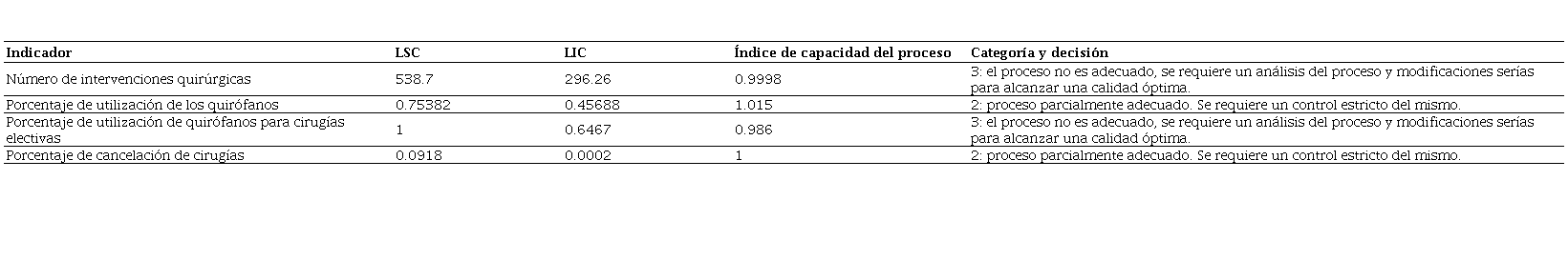 Igualmente, en la literatura consultada sobre el tema se encontraron diversos análisis aplicados a indicadores en servicios de cirugía, como también en otras áreas de salud como control de radioterapia, complicaciones en posparto como hemorragias, tiempos de estancia, cirugía infantil, entre muchos otros, donde se identificó un amplio uso en la aplicación del análisis y el control estadístico de procesos, así como su apoyo a los cuadros de mando y a la administración en salud, lo cual, en este sentido, brinda una puerta de entrada a nuevas propuestas de valor para el control de unidades clínicas y de salud desde la gestión administrativa y de los procesos.