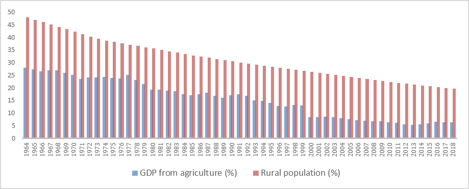 In Colombia, 99.6 % of the territory is rural (Instituto Geográfico Agustín Codazzi [IGAC], 2015), with 40.1 million hectares available for the development of agricultural activities, of which an estimate of 6.6 million hectares were abandoned or dispossessed due to the armed conflict (Ropero Beltrán, 2016). This resulted in population displacement and decreased investor interest in agricultural developments (Restrepo & Bernal Morales, 2014). In addition, during the armed conflict, this situation contributed to a decrease in the value-added of the agricultural sector (from 27.97 % in 1964 to 5.44 % in 2014) as a percentage of the national Gross Domestic Product (GDP). However, since the signing of the peace agreement, this trend has begun to reverse, breaking the downward trend and reaching 6.61 % in 2016 (see Figure 1).