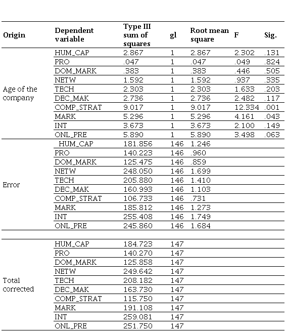 Subsequently, a Multivariate Analysis of Variance (MANOVA) was carried out to test the equality of the means of the different components that make up the competitiveness index between the two groups defined based on the companies' age.