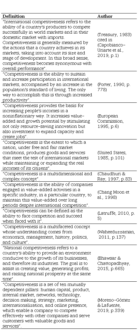 Competitiveness has been given several definitions (see Table 1), with no consensus on a single accepted one (Solleiro Rebolledo & Castañón, 2004), whose relevance changes over time. This concept has been extensively studied from different perspectives and levels (Bhawsar & Chattopadhyay, 2015), including the product, the company, the industry, and the nation (Chang Moon & Peery, 1995). In addition, there is a close relationship between all levels of competitiveness (Anca, 2012).