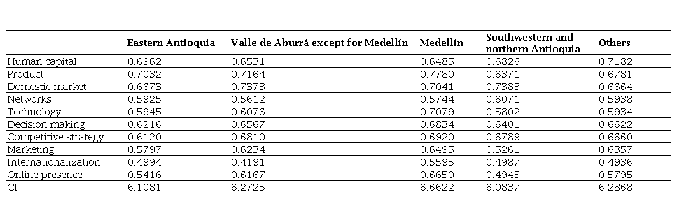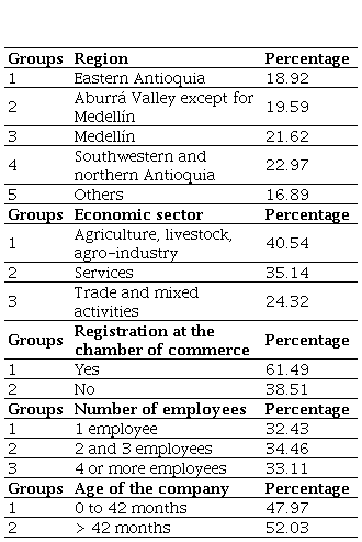The data reported by the owners of the 148 enterprises were grouped based on characteristics such as location in the department of Antioquia, economic sector, registration at the chamber of commerce to support their formal status, number of employees, and age of the company (see Table 2). The aim was to identify those factors that help explain the differences between the competitiveness indices calculated here.