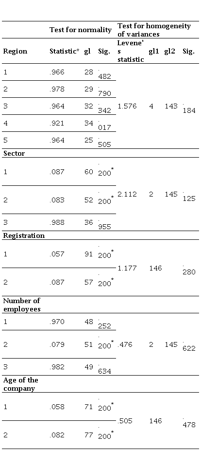 T-tests and analysis of variance (ANOVA) were employed after constructing the competitiveness index in order to identify differences between regions, economic sectors, registration at the chamber of commerce, number of employees, and age of the company. Before applying these tests, normality and homoscedasticity between the groups were first verified using the Kolmogorov–Smirnorv and Shapiro–Wilk tests for the first assumption and the Levene test for the second.