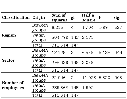 According to Table 4, there are no significant differences in the average competitiveness indices between the different regions (F = .799, p-value = .527 > .05). Differences, however, are observed between the different sectors (F = 3.188, p-value = .044) and the groups defined based on the number of employees (F = 5.520, p-value = .005). In order to determine which averages were different, Tukey's post-hoc tests were used, and the difference in averages between economic sector 2 (services) and economic sector 3 (trade and mixed activities) was 0.75 (p-value = 0.044). This indicates a higher average competitiveness index (see Annex 2) for service companies (6.7961) than for agricultural companies (6.2047) and companies dedicated to trade and mixed activities (5.9236).