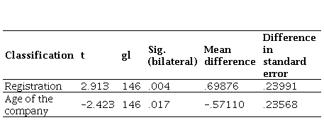 Table 5 reports the differences in averages between the two groups defined based on registration status (registered and not registered at the chamber of commerce) and the two groups defined based on age of the company. As observed, the average competitiveness index is higher for companies registered at the chamber of commerce (t = 2.913 and p-value = .004), as well as for those that have been in the market for a longer time (t = -2.423, p-value = .017).
