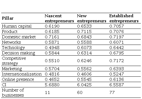 In light of the above and based on the ten components that make up the competitiveness index (Lafuente et al., 2016), we calculated the average competitive index for each group of entrepreneurs (see Table 6), with the maximum possible scale for the competitiveness index (CI) being equivalent to a value of ten (Moreno-Gómez & Lafuente, 2019).