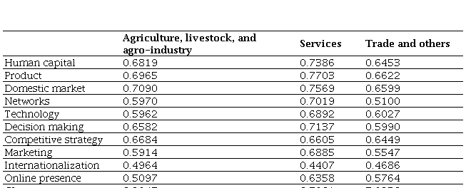 Among the various sectors considered in this study, service companies tend to be more competitive than agricultural enterprises located in rural areas of Antioquia because the latter depend on production factors in a context of uncertainty, which lowers their competitiveness indices. When analyzing the performance of the competitive index’s pillars, difficulties were observed in competitive strategy and marketing, which may be explained by the fact that entrepreneurs are usually trained in technical but not in business matters. This should be reviewed in the curricula of the faculties of agricultural sciences in order to complement this missing knowledge and, thus, improve the future performance of enterprises.
