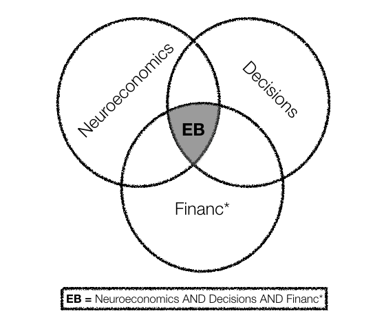 A partir de la discusión anterior, se realiza una revisión sistemática de literatura basada en una ecuación de búsqueda (EB) donde se identifican tres descriptores claves que se plantean de manera conjunta (búsqueda realizada en inglés y español): i) neuroeconomía (neuroeconomics ), teniendo en cuenta que sus instrumentos de análisis y medición han generado un avance sustancial en la economía del comportamiento, ii) decision* (decisiones), con el fin de rastrear estudios que estén asociados a la toma de decisiones, iii) financ*, buscando que con este prefijo se pueda encontrar cualquier asociación con aspectos financieros. La Figura 1 representa la EB propuesta. Cabe aclarar que el asterisco (*) se utiliza en las palabras indicadas para indicar en los motores de búsqueda la inclusión de todas las combinaciones posibles de sufijos.