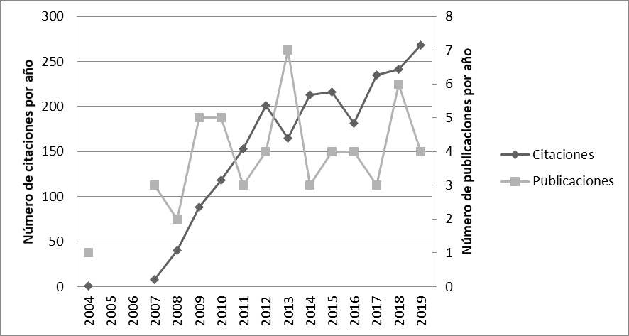 En esta sección se hizo una revisión de los 54 trabajos identificados con el planteamiento de la EB. En primer lugar, en la Figura 2, se observa el posicionamiento del área de análisis en términos del número de publicaciones y citaciones.