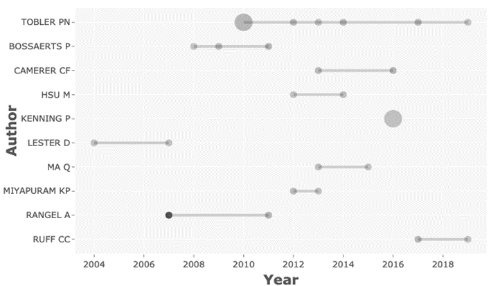 De otro lado, frente a los autores, la Figura 3 plantea el ranking acorde a su producción científica a lo largo del período de tiempo analizado (el tamaño del círculo es proporcional al número de artículos por año y la tonalidad de la escala de grises varía según el número de citaciones por año). Para el caso de la EB, se destacaron como autores relevantes en el campo P. Tobler, P. Bossaerts, M. Baddeley y C. Camerer.