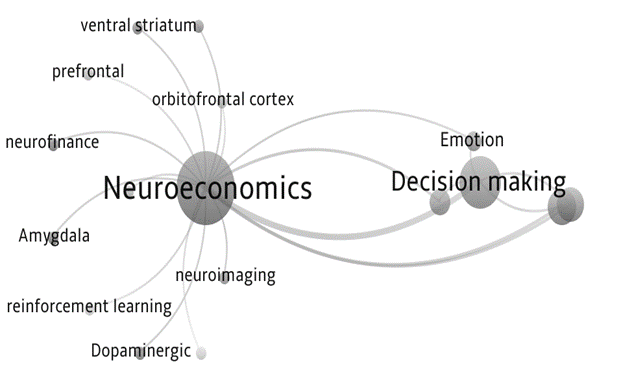 Adicionalmente, se resalta el análisis realizado de las palabras claves (keywords) donde se destaca como descriptores más comunes los asociados a neuroeconomics y decision-making, seguido por reward, fMRI, risk, emotions. El propósito de este rastreo es contemplar la pluralidad de conceptos asociados a la realización de investigaciones en el área de la neuroeconomía. La Figura 4 muestra las palabras clave (en inglés, para conservar la coherencia con las bases de datos) encontradas en la revisión realizada.