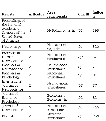 En relación con la distribución de las publicaciones según su país, basado en el análisis bibliométrico desarrollado por Aria y Cuccurullo (2017), se encontró que los países más productivos (en términos de la procedencia de los autores) son Estados Unidos (19 publicaciones), Reino Unido (6 publicaciones), Alemania (5 publicaciones) y China (4 publicaciones). De estos resultados obtenidos se destacó que no se registran casos de aplicación para América Latina (cuando se realiza un rastreo preliminar por Google Académico se encuentran diversas aplicaciones para el caso del neuromarketing y discusiones teóricas con cortas aplicaciones para la neuroeconomía en revistas que no están indexadas en las bases de datos analizadas), lo cual potencia el interés de ahondar en esta temática.