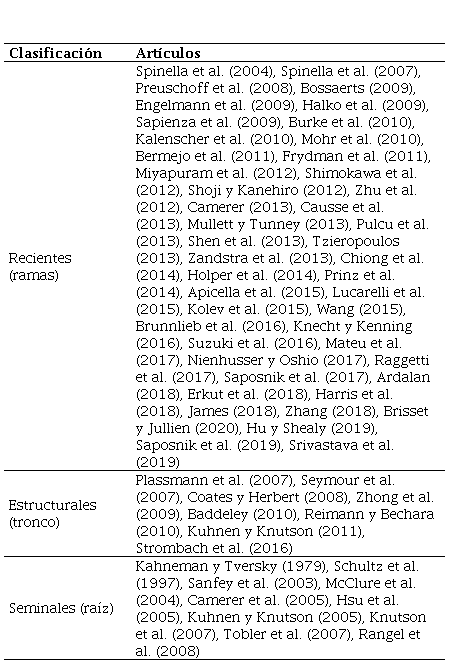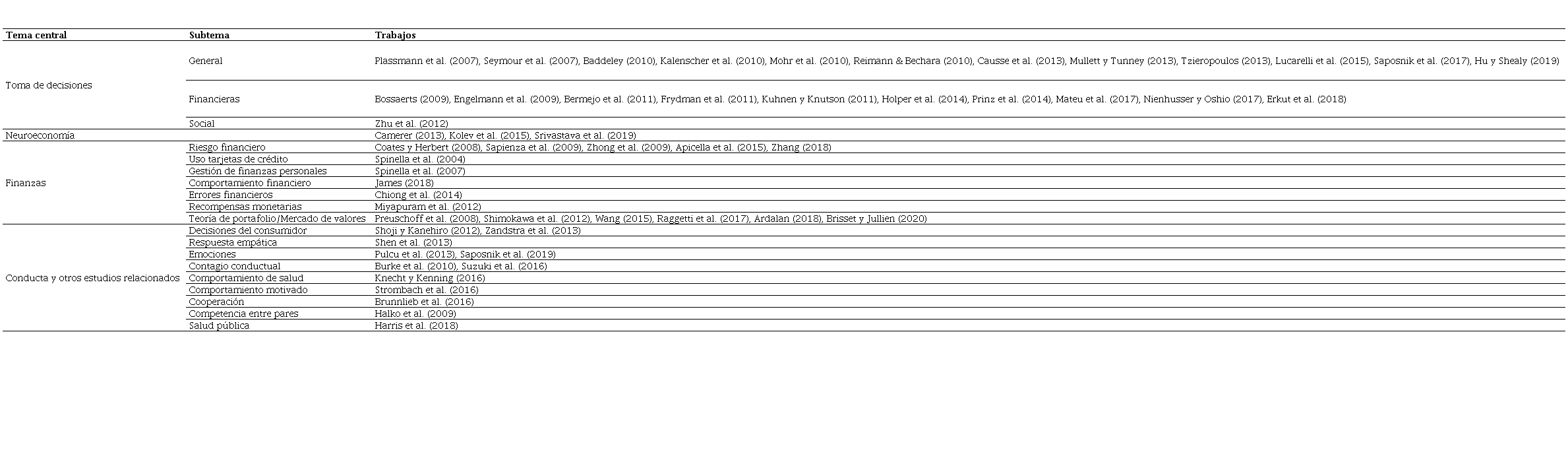 En primer lugar, la Tabla 4 muestra la clasificación de los documentos revisados según su tema central de análisis, basado en categorías creadas de manera discrecional de tal manera que capture la esencia de cada estudio: 1) toma de decisiones, con el fin de rastrear estudios que iluminen sobre la aplicación de la neuroeconomía para resolver problemas asociados a este tema; 2) neuroeconomía, dirigido especialmente a la identificación de estudios que hayan hecho revisión de literatura o discusión teórica sobre este tema; 3) finanzas, que abarca estudios que analizaron diferentes aspectos de esta área como riesgo, gestión de finanzas personales, sistemas de inversión, entre otros; 4) conducta y otros estudios relacionados, la cual abarca diferentes escenarios de comportamiento de los agentes económicos con diferentes herramientas utilizadas y algunos estudios que analizaron aspectos puntuales de la salud humana como el envejecimiento, la obesidad y la modulación hormonal.