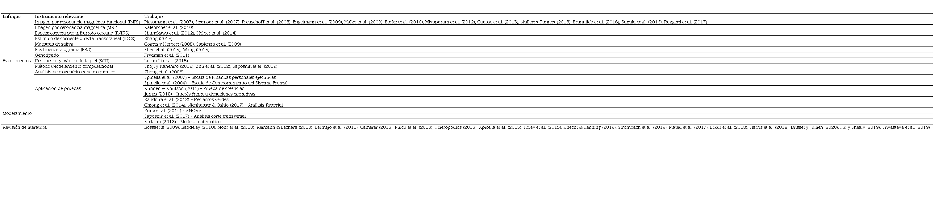 En segundo lugar, se procedió a clasificar los estudios revisados en la EB según el enfoque de los mismos, planteando cuatro criterios de clasificación: 1) experimentos, los cuales se subdividen según el instrumento o herramienta relevante para el análisis del comportamiento de los sujetos (tales como resonancia magnética, electroencefalograma, pruebas de saliva, entre otros); 2) método cuantitativo, que recoge algunos artículos que, para comprobar sus hipótesis, se apoyan en el modelamiento estadístico y econométrico tradicional; 3) revisión de literatura, sección que recoge los trabajo que realizan un rastreo teórico a partir de revisiones de literatura, sistemáticas y no sistemáticas, que contextualizan los avances en los campos de estudio; 4) corta comunicación, que menciona un estudio arrojado por las bases de datos que plantea los elementos esenciales de su proyecto (y que no podría ubicarse en los campos anteriores). La Tabla 5 muestra la clasificación mencionada.