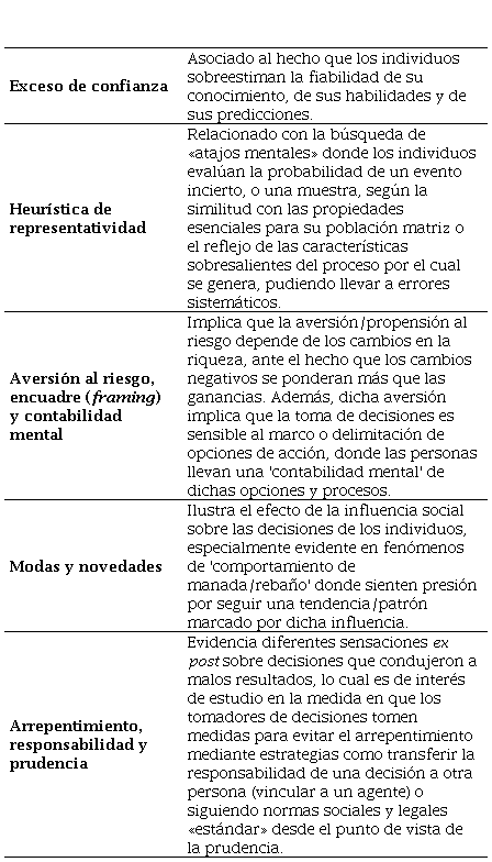 Microfundamentos de las finanzas comportamentales: en la misma lógica de los aportes de Simon (1989), Kahnemany y Tversky (1979) y otros autores de las finanzas comportamentales, De Bondt y Thaler (1995) realizan una detallada revisión de literatura donde destacan que el proceso de toma de decisiones y elaboración de predicciones de parte de personas, firmas y mercados están sujetos a la presencia de la racionalidad limitada de los individuos, los cuales están caracterizados por los siguientes fenómenos de comportamiento resumidos en la Tabla 6.