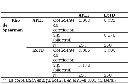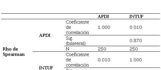 En la Tabla 11 se muestra el p-valor obtenido (0.870), lo que evidencia la inexistencia de correlación entre las variables de estudio. También se analiza el coeficiente de Spearman, el cual fue de 0.010, lo que significa que no existe correlación entre las variables de apropiación digital y la intención de uso en el futuro.