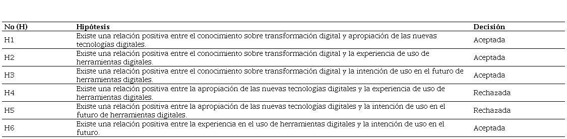 Esta investigación analizó la correlación existente entre el conocimiento sobre transformación digital y la apropiación de nuevas tecnologías digitales, de igual forma, se buscaba determinar si existe una relación positiva entre el conocimiento sobre la TD y la experiencia en el uso de herramientas digitales, de igual forma se buscó determinar la relación entre el conocimiento sobre TD y la intención de uso en el futuro. Otra correlación que se calculó fue entre la apropiación de tecnologías digitales y la experiencia en el uso de herramientas digitales, por lo tanto, era necesario determinar la relación entre apropiación de tecnologías digitales e intención de uso en el futuro. Finalmente fue importante para este estudio determinar la correlación entre experiencia en el uso de herramientas digitales y la intención de uso en el futuro.