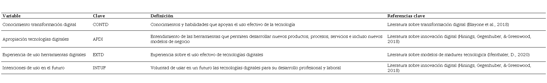 El cuestionario contenía dieciséis afirmaciones, incluyendo cuatro variables de control, tres preguntas sobre datos demográficos, cada pregunta fue medida a través de una escala Likert de cinco puntos: (1) totalmente en desacuerdo a (5) totalmente de acuerdo. El cuestionario fue adaptado al contexto y modificado de la revisión de literatura; en cuanto a la variable conocimiento sobre la transformación digital, cuyos principales referentes son Blayone et al. 2018; Gefen, 2000, sus estudios se basan en el conocimiento que posee el usuario final en las plataformas de comercio electrónico, las variables apropiación de tecnologías digitales e intenciones de uso en el futuro, que tomaron como referente a Hinings et al., 2018; Ifenthaler y Egloffstein, 2020, sus investigaciones se basan en desarrollar un modelo holístico de madurez tecnológica, que identificó los factores que median la madurez digital y el desempeño organizacional (motivos y actitudes); por otra parte, determinó la importancia de la cultura organizacional para la adopción de nuevas tecnologías digitales; finalmente, la variable experiencia de uso de herramientas digitales que toma como referente a Ifenthaler y Egloffstein, 2020, en sus estudios se refiere a la necesidad de experimentar previamente que las nuevas tecnologías para afianzar su uso en el futuro, (ver Tabla 1).