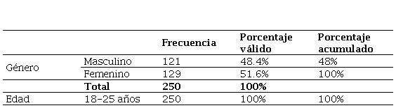 A partir de lo anterior, se solicitó la participación voluntaria de los encuestados y se procedió a suministrar el cuestionario vía internet a 250 personas, donde inicialmente se les solicitó su consentimiento para el uso de los datos. La tasa de respuesta fue del 100 %.