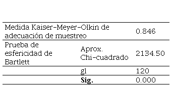 Para poder realizar un análisis factorial exploratorio (AFE), se llevó a cabo la prueba de KMO y Bartlett, esta prueba se realiza con el objetivo de comprobar si es posible realizar un AFE o no. Un valor aceptable para esta prueba es superior a 0.60, el resultado para este grupo de datos fue 0.846, lo cual se considera muy bueno, la prueba de Bartlett es altamente significativa p=0.000, lo que quiere decir que existe una alta correlación entre los factores, por lo tanto, realizar un AFE es adecuado (ver Tabla 3).