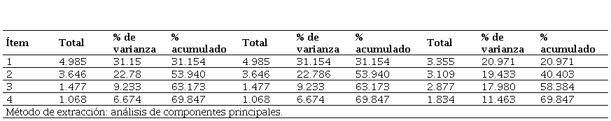 A continuación, con el objetivo de realizar un análisis de correlaciones entre factores, el AFE agrupó el conjunto de datos en cuatro variables, las cuales explican el 69.84 % de la varianza (Churchill, 1979), (ver Tabla 4).
