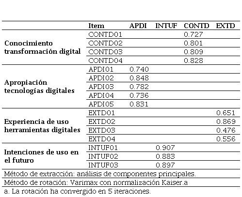Así, se revisó la matriz de correlación de ítems, donde se aplicó un método de extracción de principales factores y una rotación Varimax con normalización Kaiser, esto con el objetivo de garantizar la relación de los ítems que conforman cada variable (Ha y Stoel, 2009), (ver Tabla 5).
