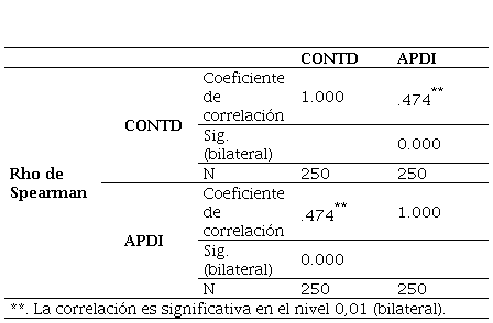 La Tabla 7 evidencia el p-valor obtenido (0.000), que valida la presencia de correlación entre las variables de estudio. De igual forma, se observa el coeficiente de Spearman, donde el resultado fue de 0.474, lo cual significa una correlación positiva moderada entre las variables analizadas.
