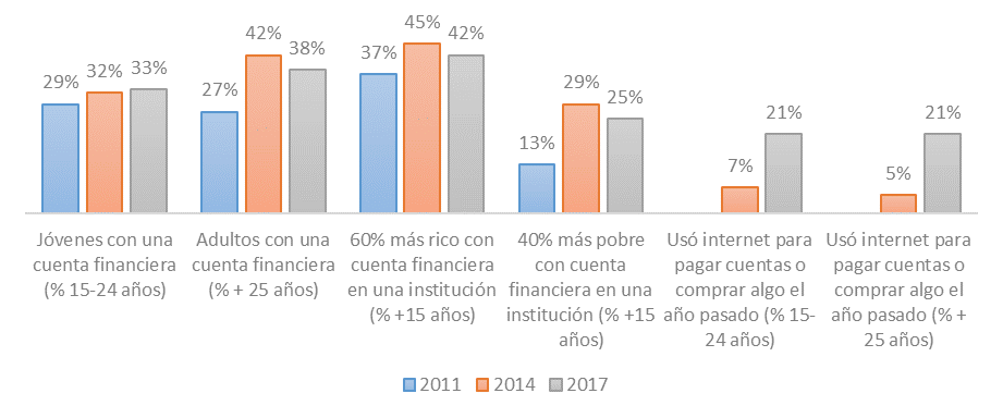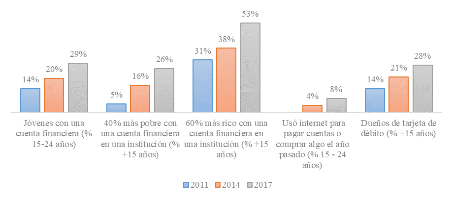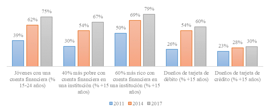 Fuente: elaboración propia con datos de ( Demirguc-Kunt, Klapper, Singer, Ansar, & Hess, 2018).Como se observa en la Figura 1, los dos primeros conjuntos de columnas demuestran un incremento en la tenencia de cuentas financieras, tanto en personas menores como mayores de 25 años, con un mayor incremento en este último grupo. Seguramente la elevada adopción de tarjetas de débito por parte de la población adulta durante los últimos años sea en gran medida el motivo: entre 2012 y 2015 el porcentaje de adultos con tarjeta de débito se incrementó en 7 puntos porcentuales, pasando de 35 % a 42 % ( Comisión Nacional Bancaria y de Valores, 2017).