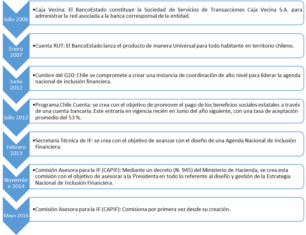 A diferencia de México, que tuvo un punto de inflexión en su historia mediante la sanción de la Política Nacional de Inclusión Financiera (PNIF) en el año 2016, la performance chilena ha demostrado un compromiso histórico con la inclusión financiera a través de iniciativas más graduales y sostenidas en el tiempo. Como se dijo, estas han surgido propiamente desde el Estado (operando mediante el Banco Estado), siendo una clara diferencia con respecto a los otros casos de estudio. En la Figura 2 se listan las más importantes.