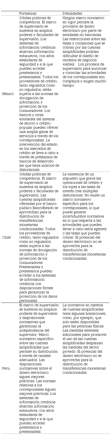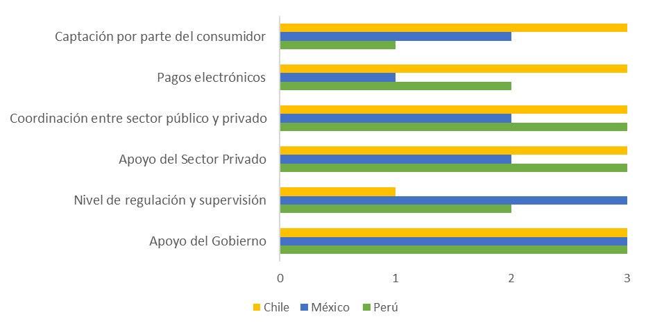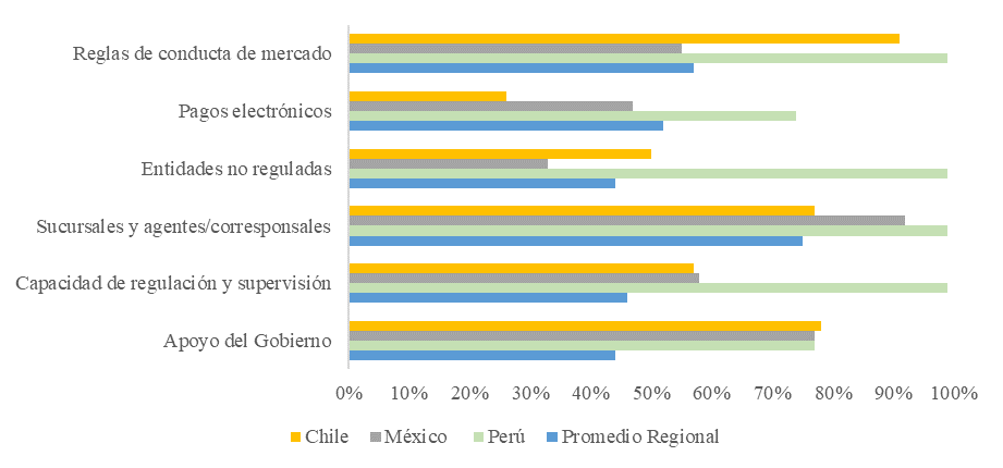 Según un estudio realizado por el Banco BBVA en el año 2017, Chile, México y Perú son de los países en la región que disponen de los mayores marcos regulativos «facilitadores» (facilitan la adopción y adaptación de las innovaciones que permiten, de forma segura, aumentar el uso de los servicios financieros por parte de grandes segmentos de la población, especialmente la población más pobre) únicamente situándose por detrás de Paraguay ( Pacheco & Rojas, 2017).