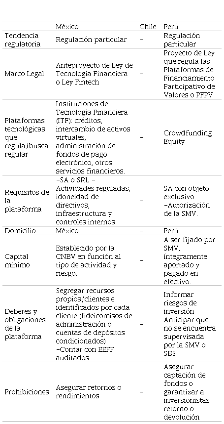 Fuente: elaboración propia con base en Campos & Huangal (2017).En el caso de Chile, no hay leyes o regulaciones específicas sobre el sector por lo que las iniciativas Fintech han tenido que ir adaptándose al marco regulatorio del sistema financiero tradicional. De todos modos, desde hace unos años las autoridades económicas del país evalúan la posibilidad de generar un marco normativo específico, particularmente para la actividad de crowfunding, que ha tenido un mayor desarrollo relativo a nivel nacional. Esta iniciativa busca generar una regulación clara, que resuelva los conflictos potenciales entre la regulación financiera general y ciertas modalidades de la operación Fintech ( SBIF, 2016).