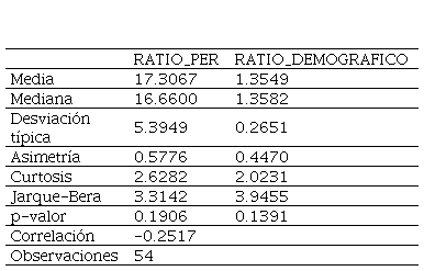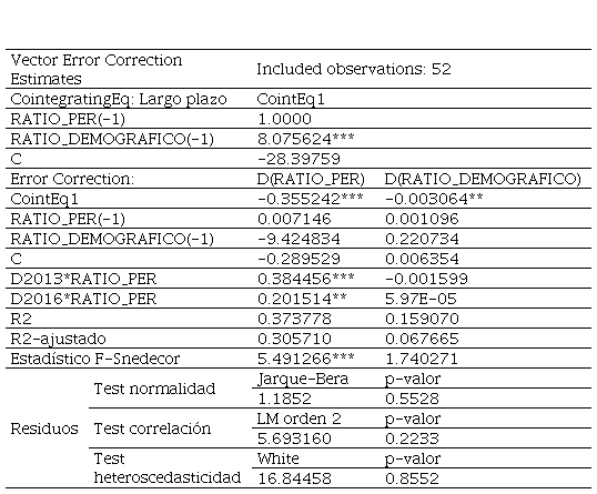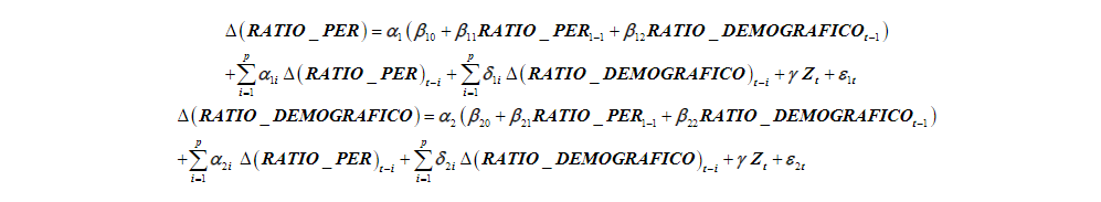 Será el modelo a estimar denotando (RATIO_PER) y (RATIO_DEMOGRAFICO) las variables endógenas del modelo en diferencias; , la velocidad de ajuste a corto plazo para ambos ciclos, y los coeficientes a estimar correspondientes a valores pasados de las variables endógenas en diferencias y variables exógenas, respectivamente; y, , el término de perturbación aleatoria distribuido de forma serialmente independiente.