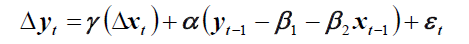 donde, denota el MCE siendo <0 ; el parámetro mide el efecto a corto plazo que la variable X t ejerce sobre y t; recoge el efecto a largo plazo que la variable ejerce sobre y el término de perturbación aleatoria, respectivamente. La formulación estacionaria de variables no estacionarias describe la variación de la variable alrededor de su tendencia a largo plazo en términos de factores exógenos, X t , integrados de orden cero y la corrección del error , error del equilibrio en el modelo de cointegración ( Engle & Granger, 1987).